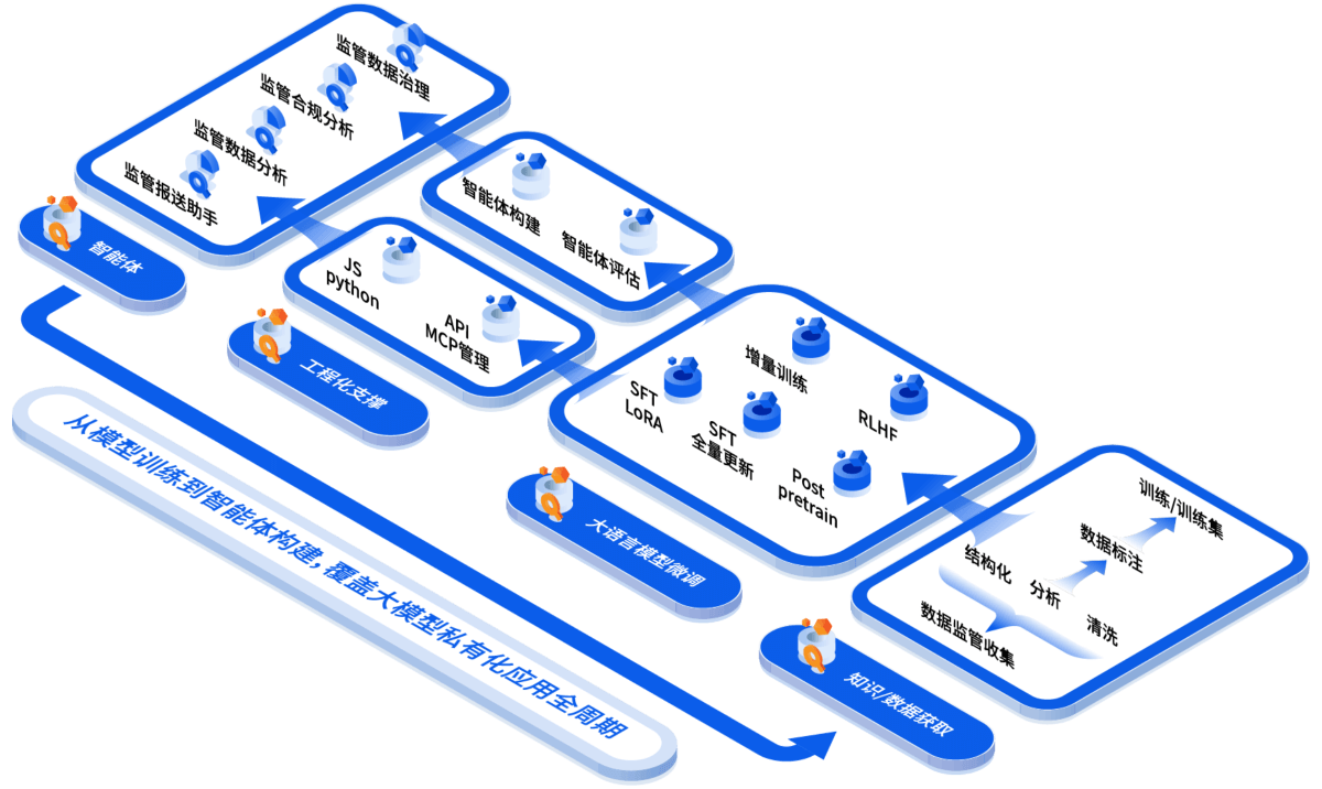 智能体开发:智能体开发:我们已经通用大语言模型微调后得到的金融监管领域大语言模型为基石,搭建契合金融监管特点与需求的大语言模型智能体系。针对不同应用场景,精心构建并优化相关提示词,充分释放大语言模型的潜力,最大程度减少模型幻觉问题的出现。与此同时,我们借助API、MCP以及Python等技术手段,将大语言模型与传统信息系统处理能力相融合,从而提升智能体响应的及时性与结果的准确性。